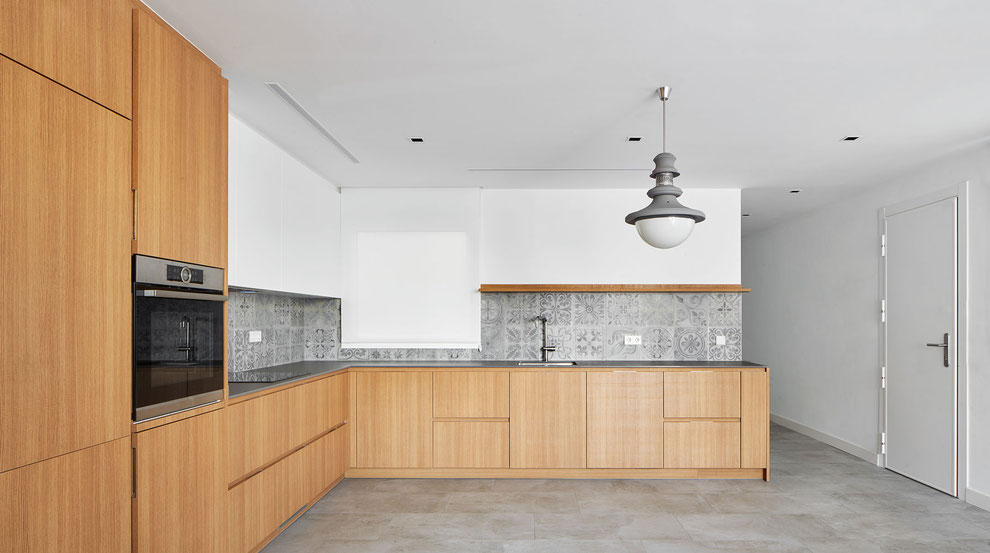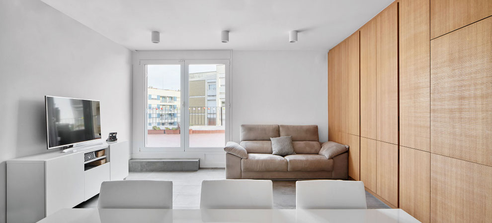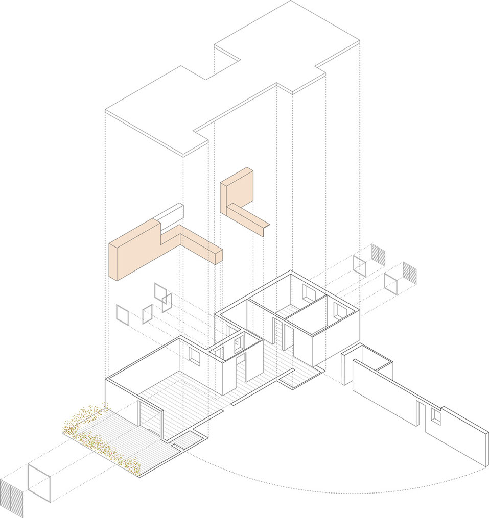Una vegada analitzada la morfologia de l’habitatge existent, s’opta per fer les mínimes intervencions d’enderroc possibles amb l’objectiu d’unificar estances per crear una àmplia zona de dia i la minimització del passadís d’accés. Així s’acaba creant un gran espai fluït i canviant que fa de l’habitatge final un espai fàcil d’habitar i on la zona de dia esdevé un espai lluminós i ampli que aprofita el màxim possible la geometria per assumir els usos de cuina, sala d’estar i menjador. A la vegada que el passadís reduït vincula espacialment aquesta zona amb l’estudi, creant una major amplitud visual i aportant llum a la nova estratègia longitudinal amb la que l’habitatge es relaciona ara amb l’exterior, de manera que des de la terrassa es pot fer un recorregut continu y sense barreres visuals fins a les dues habitacions amb vistes, que s’han mantingut en la seva posició original.